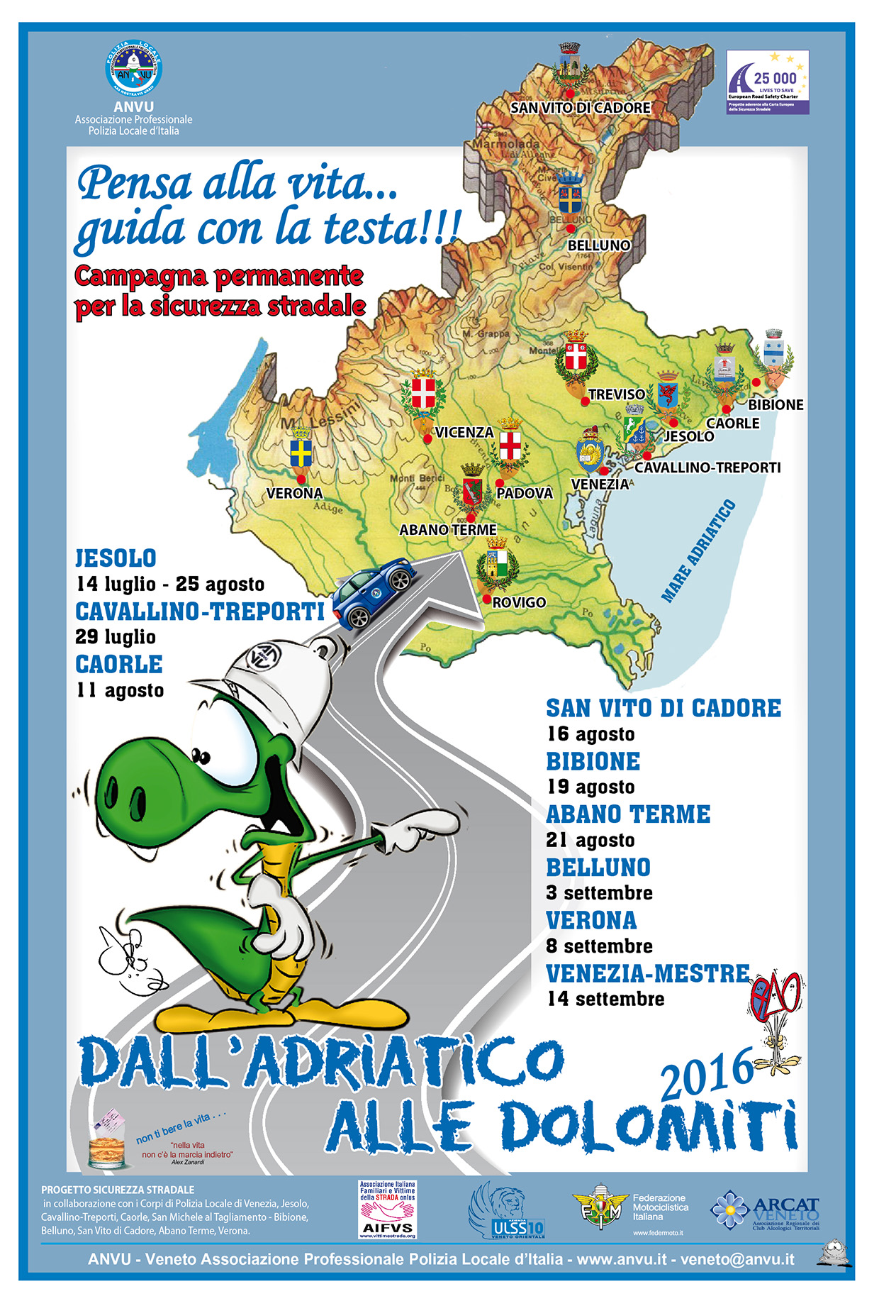Accanto alla organizzazione dall’ANVU, vi è la collaborazione delle Associazioni partner del progetto che da anni danno un rilevante contributo di presenza con stand e operatori quali: la Protezione Civile di Jesolo, l’Arcat Veneto (Associazione Regionale dei Club Alcologici Territoriali) con l’Arcat Basso Piave, l’Aifvs. (Associazione Italiana Familiari Vittime della Strada Onlus), il SerD e il 118 dell’Azienda U.L.S.S. “Veneto Orientale” con personale dell’Ospedale di Jesolo.