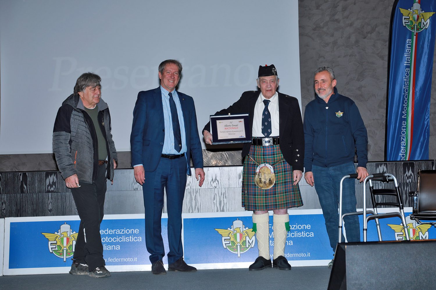 Tanti piloti premiati hanno voluto un abbraccio o una foto e Macdonald non si è risparmiato, rimanendo sul palco fino alla fine della cerimonia. Inoltre lo “scozzese” ha ricevuto una targa dalle mani del presidente della Federmoto, Giovanni Copioli, che ha voluto essere presente per salutare i piloti dell’Epoca e questo grande personaggio, definito “un esempio infinito di passione per il motocross”.
