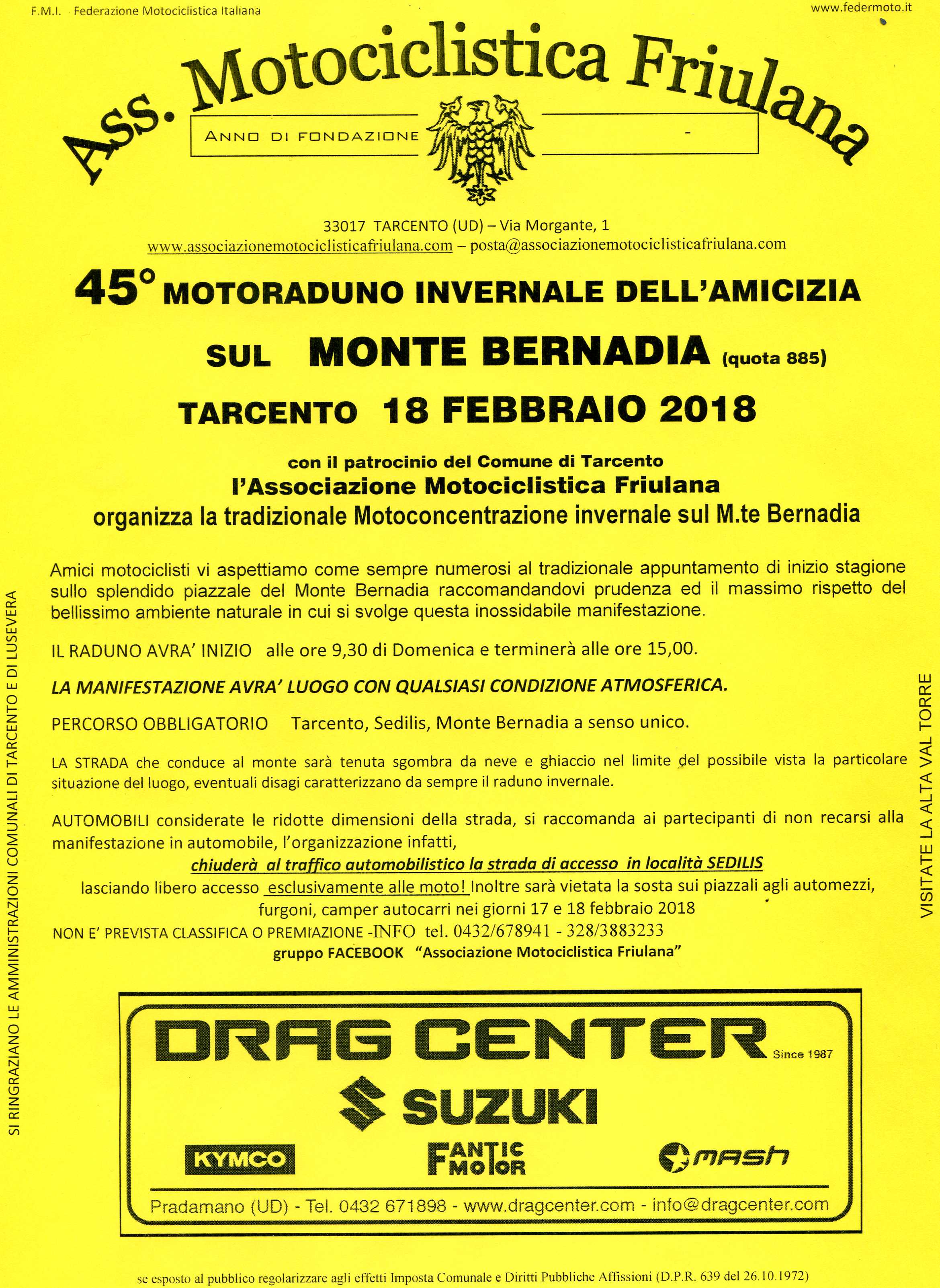 Il primo appuntamento stagionale per i motociclisti Friulani e delle vicine regioni avrà luogo sullo splendido piazzale in cima al Monte Bernadia, sopra Tarcento (UD), dove domenica 18 febbraio 2018 si svolgerà la tradizionale Motoconcentrazione Invernale dell’Amicizia, giunta all’ invidiabile traguardo della sua 45^ edizione, iniziativa che sin dal lontano 1973 rappresenta al meglio l’essenza del motociclismo invernale.