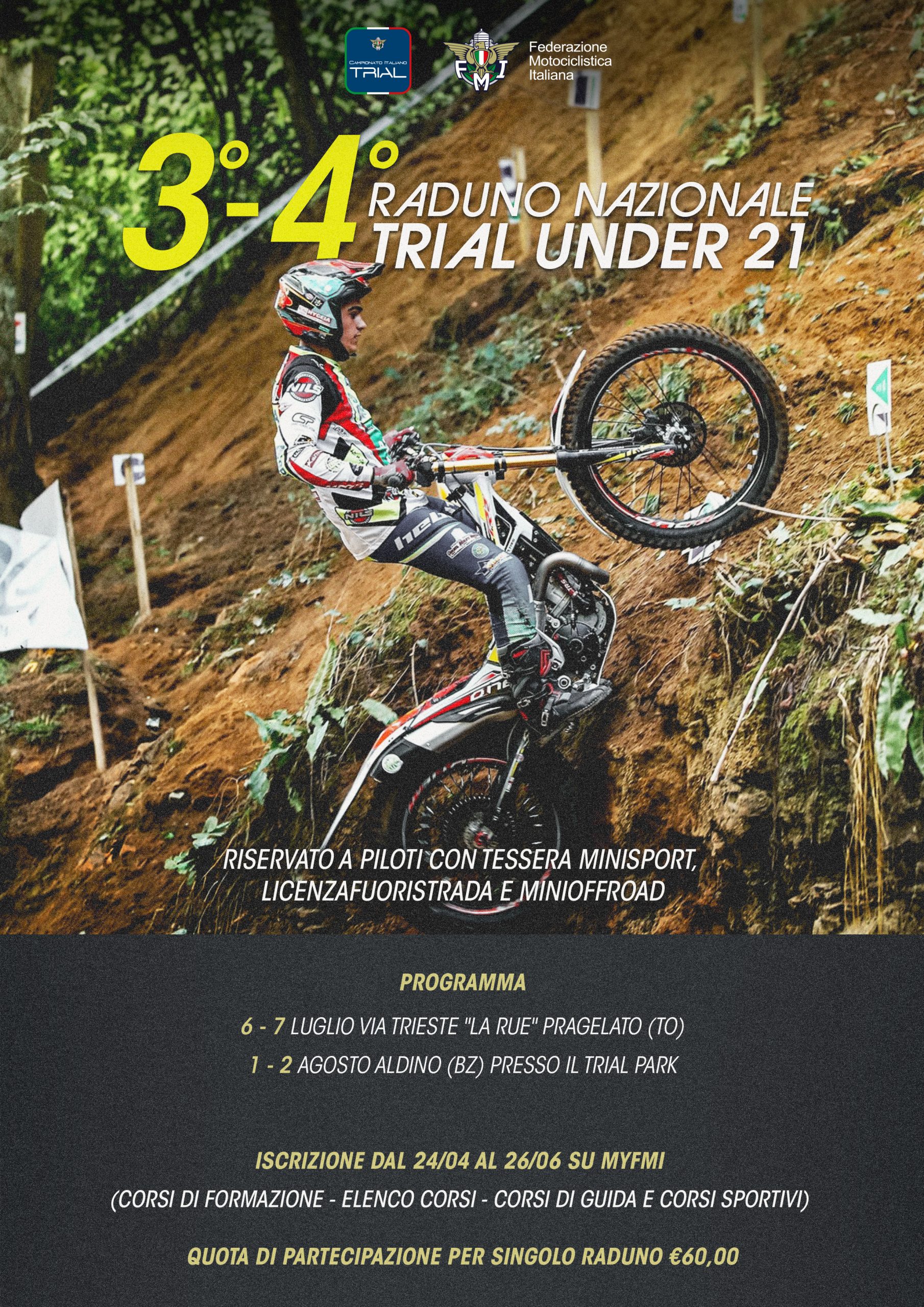 Gli appuntamenti del 3° e il 4° Raduno Nazionale Trial Under 21 sono dedicati ai giovanissimi nati tra il 2005 e il 2020, in possesso di Tessera Minisport e Licenza Minioffroad e Fuoristrada. Per entrambe le date sono aperte le iscrizioni che dovranno essere effettuate entro il 26 giugno 2026 tramite piattaforma MyFMI. La quota di partecipazione è fissata a 60 euro per ciascun raduno e copre l’intero fine settimana di attività.