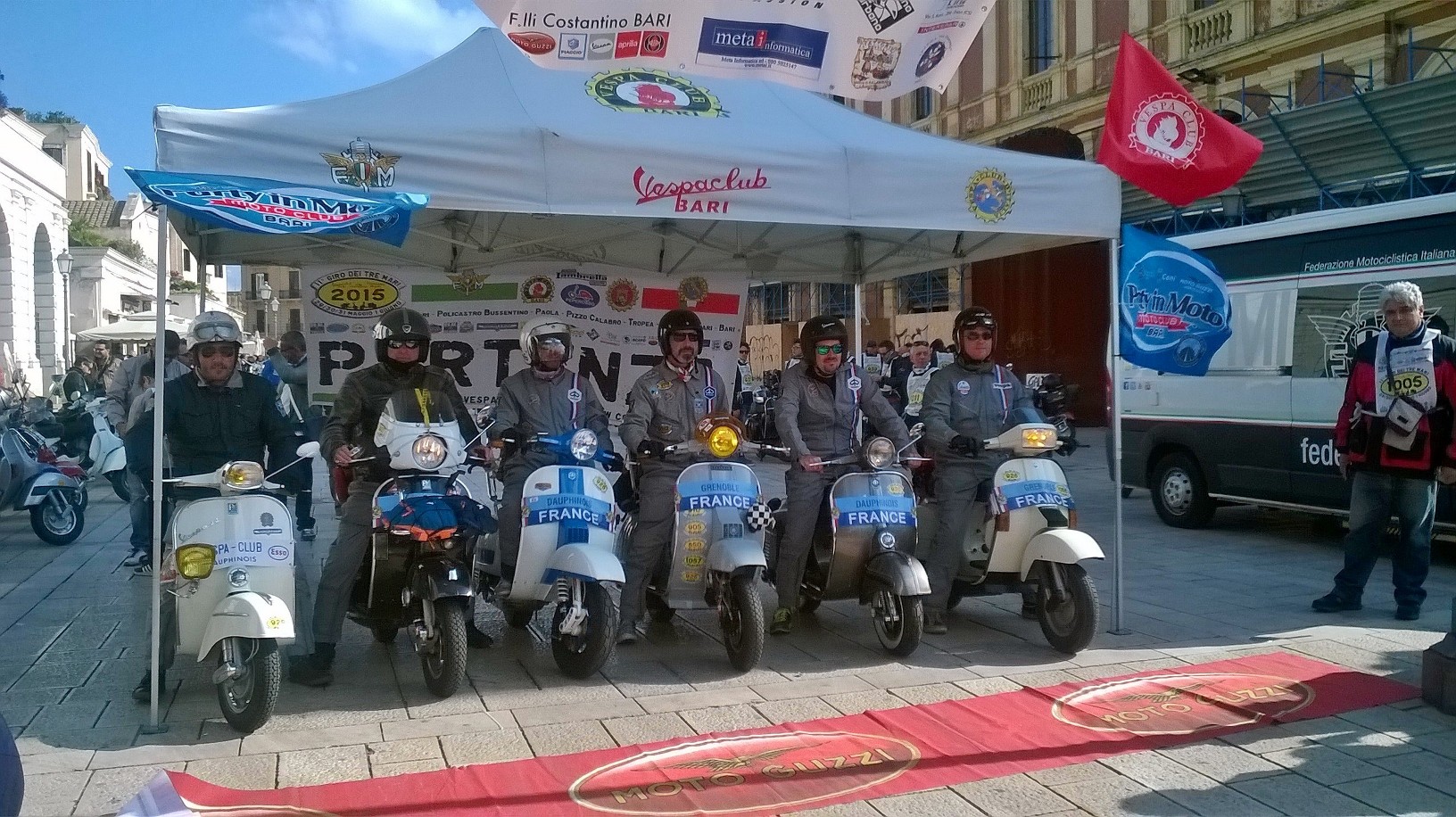 La “Tre Mari” 2015 è scattata, puntualissima, questa mattina da Piazza del Ferrarese, sul lungomare di Bari, con la bandiera a scacchi abbassata sulla prima squadra che iniziava il percorso dei 233 Km. tra Puglia, Basilicata e Campania, con meta finale Policastro Bussentino, località balneare della riviera del Mar Tirreno, che verrà raggiunta intorno alle diciassette. Sono 203 gli iscritti a questa edizione (ricordiamo, a numero chiuso) di cui una trentina gli equipaggi dall’estero (Germania, Francia e Inghilterra). La macchina organizzativa messa in moto dal Vespa Club Bari, che si avvale della collaborazione del Moto Club Peperosso e del Vespa Club Paola, è imponente e collaudatissima; d’altronde undici edizioni alle spalle hanno consentito un continuo perfezionamento. Ieri, nell’Hotel 7 Mari nei pressi del Quartiere Fieristico , si sono svolte le operazioni preliminari, con il perfezionamento delle iscrizioni e il momento magico del briefing, primo contatto degli organizzatori con i partecipanti, che si sono rivelati attenti ma entusiasti, pronti ad iniziare questa avventura che li porterà a raggiungere nuovamente Bari lunedì 1 giugno, dopo quattro tappe e dopo aver percorso più di 800 Km.