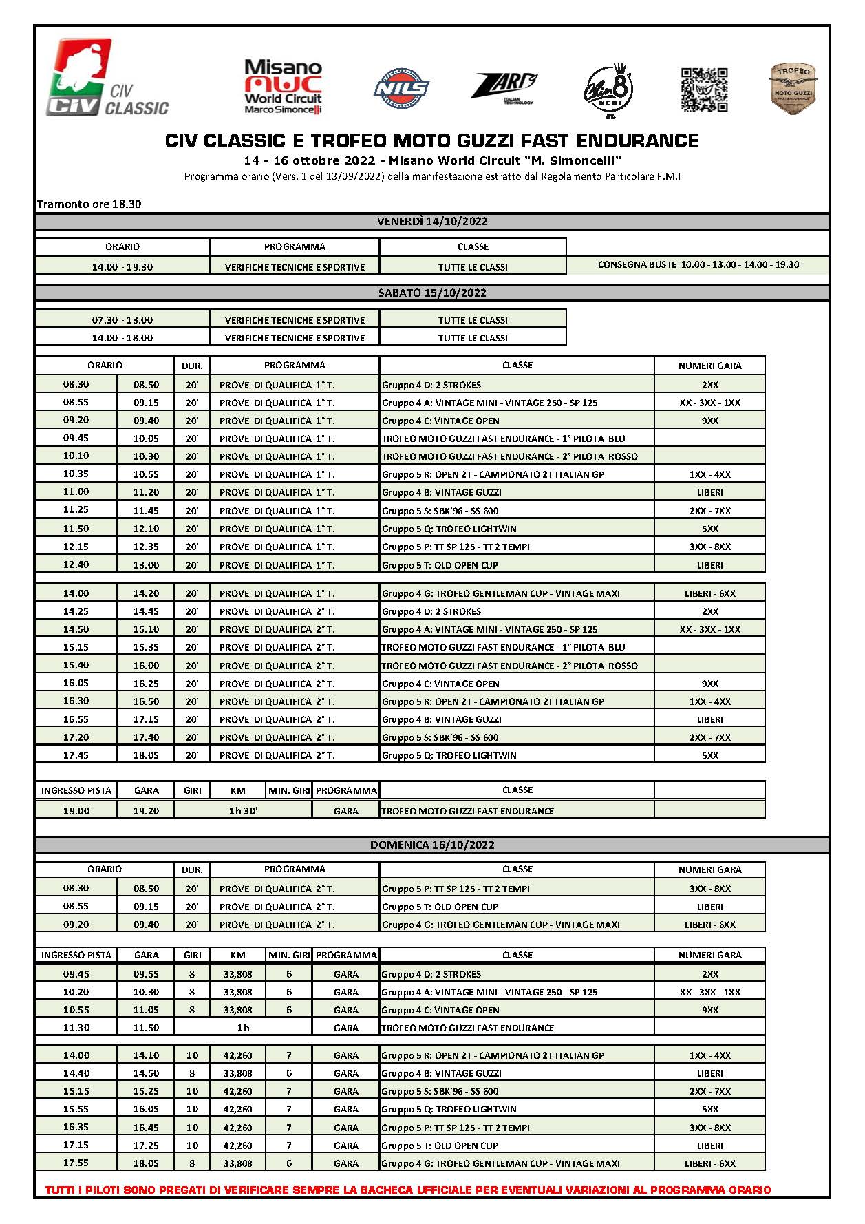 L’Ufficio Epoca Sport FMI rende noto l’Orario Ufficiale dell’ultimo appuntamento CIV Classic 2022, in calendario a Misano World Circuit il 15 e 16 ottobre.