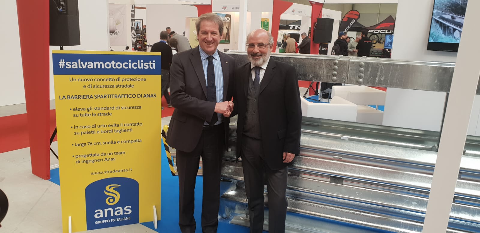 A Roma Motodays la Federazione Motociclistica Italiana si occupa anche di sicurezza stradale. Lo fa attraverso le sue iniziative, trasmettendone i valori a tutti gli appassionati, e grazie ai rapporti istituzionali. A margine dell’inaugurazione del Salone della Moto capitolino, il Presidente FMI Giovanni Copioli ha incontrato Lelio Russo, dirigente di ANAS. Nell’occasione è stata evidenziata, da parte del Presidente FMI, l’importanza della terza fascia salvamotociclisti sui guard rail; dal canto suo, l’Ingegnere Lelio Russo ha sottolineato come i chilometri coperti da questo nuovo dispositivo siano in aumento.