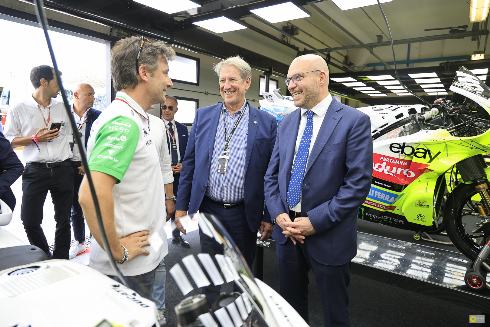 Il Presidente della Camera, Lorenzo Fontana, è stato accolto presso il Centro Tecnico Federale dal Presidente FMI Giovanni Copioli a poche ore dal via della gara di MotoGP. Insieme hanno fatto visita a Carmelo Ezpeleta, CEO di Dorna (società promoter della MotoGP che ha pienamente supportato le attività federali) e ai box di Aprilia e Ducati, incontrando i vertici di Case e Team, verificando ancora una volta quanto l’Italia sia l’anima del motociclismo mondiale. Fontana e Copioli hanno inoltre dialogato affrontando temi sportivi ed extrasportivi dando continuità ad una collaborazione che aveva già trovato input ad aprile in Qatar. Entrambi profondamente appassionati di motociclismo, hanno poi vissuto l’atmosfera della gara, analizzato i dettagli tecnici delle moto e ammirato le gesta dei piloti in pista.