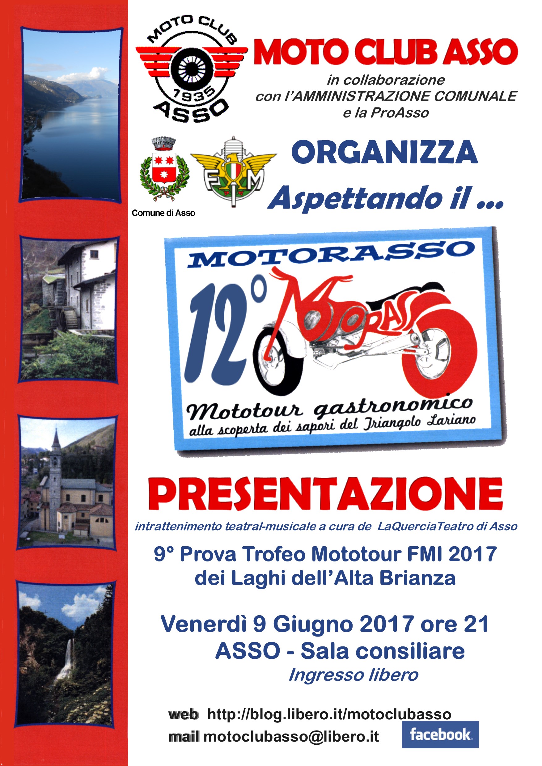 Venerdì 9 giugno ad Asso (MB) si terrà la presentazione del 12° MotorAsso, un tour gastronomico in motocicletta che si svolgerà nel triangolo lariano. A partire dalle 21, presso la Sala Consiliare del Comune, vi sarà intrattenimento teatral-musicale a cura de La Quercia Teatro. Il tutto, in attesa dell’evento che sarà valido come 9° prova del Trofeo Mototour FMI 2017 dei Laghi dell’Alta Brianza.