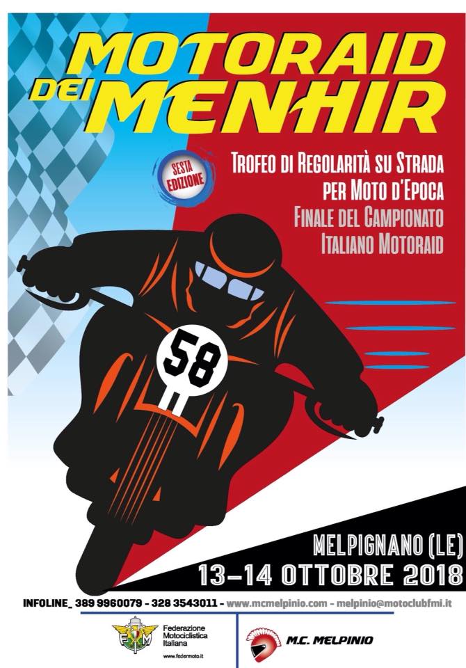 Si rinnova, per la sesta volta, il consueto appuntamento nel Salento con il Motoraid dei Menhir, Trofeo di Regolarità su strada per moto d’epoca: quest’anno l’evento organizzato dal Moto Club Melpinio ospiterà la Finale del Campionato Italiano. Ciò significa che nel Salento sarà incoronato il Campione Italiano Motoraid e questo comporterà una maggiore presenza di piloti e di pubblico.