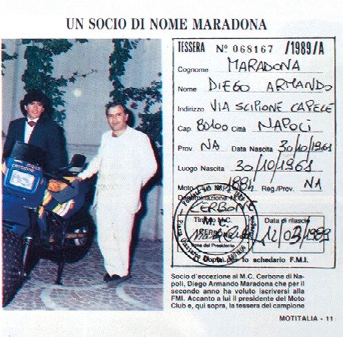Con il numero di Giugno di Motitalia nasce “Amarcord”, una nuova rubrica che mira a valorizzare la storia del motociclismo, per scoprire aneddoti e curiosità. Fonte principale di ricordi ed emozioni di un tempo sarà l’Archivio Storico FMI che propone a tutti i Tesserati contenuti davvero unici. Il primo vede protagonista il Pibe De Oro, quel Diego Armando Maradona che incantò Napoli e il mondo del calcio con le sue magie. El Diez (un altro dei suoi soprannomi) fu Tesserato alla FMI con il Moto Club Cerbone nel 1988 e 1989.