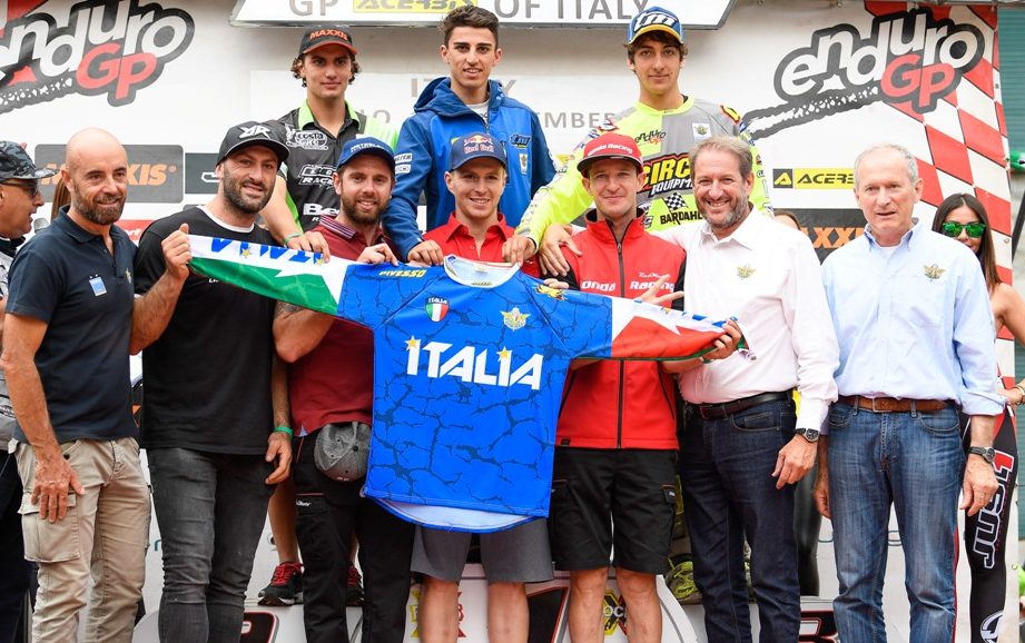 E’ stata presentata oggi, durante le premiazioni del Gran Premio d’Italia del Mondiale Enduro a Edolo (BS), la Maglia Azzurra FMI. Una divisa prestigiosa, indossata dai piloti italiani che rappresentano il nostro Paese nelle competizioni internazionali a squadre nazionali. A svelarla sono stati il Presidente FMI Giovanni Copioli, il Coordinatore del Comitato Enduro FMI, Franco Gualdi, il Commissario Tecnico Enduro FMI, Cristian Rossi e i piloti azzurri convocati alla Sei Giorni di Enduro – in programma dal 12 al 17 novembre in Cile – per il FIM World Trophy (Davide Guarneri, Thomas Oldrati, Giacomo Redondi, Alex Salvini) e per il FIM Junior World Trophy (Matteo Cavallo, Davide Soreca, Andrea Verona).